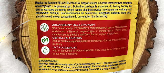 PERFECTA - Maska na tkaninie Relaxed Jamaica. Happy&relaxed o bardzo intensywnym działaniu nawilżającym i regenerującym. Dokładne przyleganie materiału do twarzy tworzy na skórze warstwę ochronną, dzięki czemu składniki szybko i równomiernie wnikają oraz efektywnie działają. Rekomendowana do całorocznej pielęgnacji każdego typu cery, niezależnie od wieku, szczególnie do cery suchej i bardzo suchej. ORGANICZNY OLEJ Z KONOPI olej z nasion konopi pozyskiwany z certyfikowanych upraw. Ma doskonałe właściwości odżywcze, regenerujące i odmładzające. Chroni przed nadmierną utratą wody z naskórka. Maskę miałam okazję wypróbować dzięki współpracy z PureBeauty.pl, dziękuję bardzo. Jedno opakowanie kosztuje około 15 złotych.